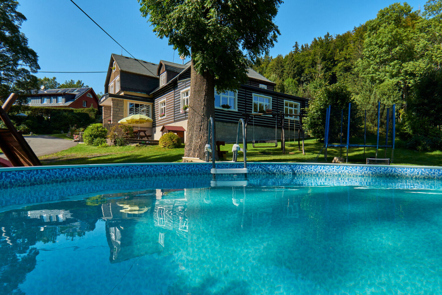 Im Sommer kann man in dem grossen Garten die Sonne im Liegestuhl geniessen, Tischtenis spielen, Trampoline, Feuerstelle mit Grillplatz, Spiel – und Sportplatz benutzen.