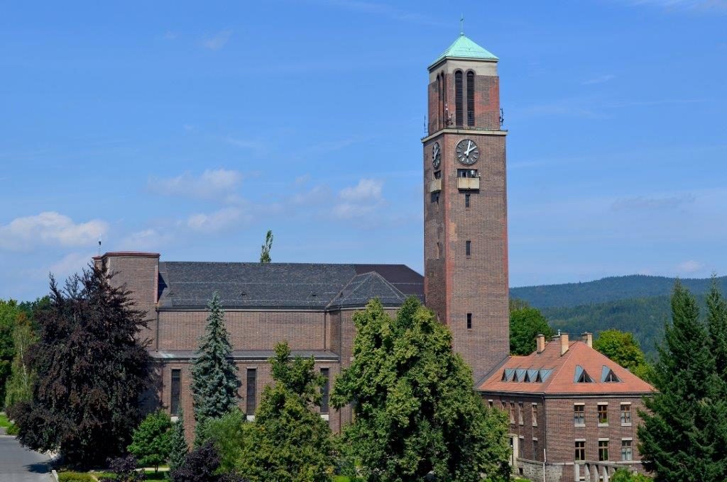 Before being overcome by the view of the monumental Church of the Sacred Heart of Jesus on the Upper Square, where 28. října Street will take you, notice the life-sized knight at the corner of building no. 91/2. We can but speculate why Alfred Kolb placed him there on his house. However, the knight still guards the house to this day, unlike the statue of the German knight Rüdiger from the Song of the Nibelungs, which formerly stood before the church and was removed after the war. We recommend that you rest a while on the square and take in the view of the lookout tower at Černá Studnice, which can be seen on the horizon.