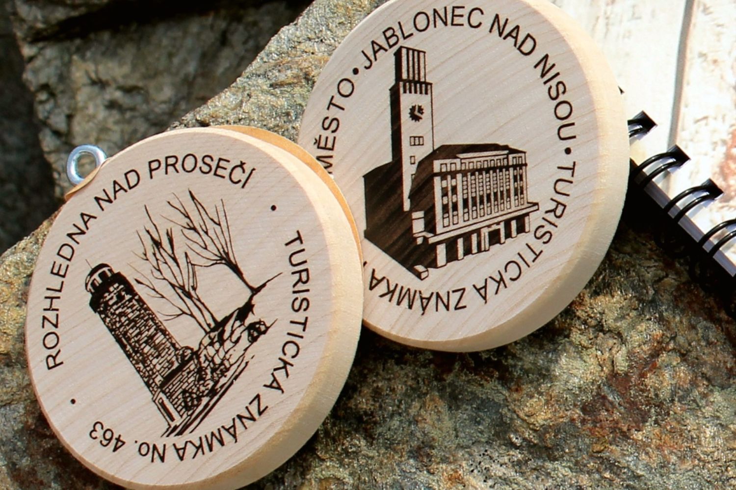 Kulaté, dřevěné, vypalované plakety jsou suvenýrem a zároveň “potvrzením” o dosažení turisticky atraktivního místa. V turistickém infocentru v Jablonci nad Nisou můžete zakoupit turistickou známku č. 651 – Jablonec nad Nisou a č. 463 – rozhledna nad Prosečí.