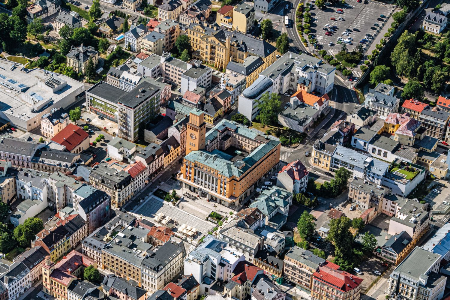 Mírovému náměstí (dříve Alter markt – Starý trh), nejstaršímu v Jablonci, vévodí budova radnice postavená v letech 1931–1932 ve funkcionalistickém stylu. V létě její věž slouží jako rozhledna. Osvěžit se můžeme u pítka se sochou představující alegorii jabloneckého průmyslu a obchodu, která byla vytvořena v době největšího rozkvětu města r. 1870.