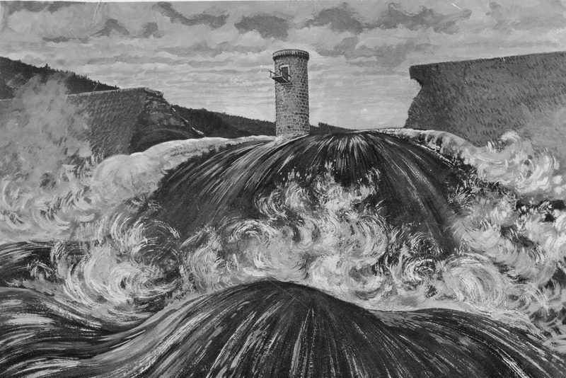 - Protržená přehrada na dobovém obrázku