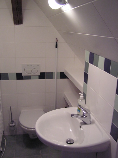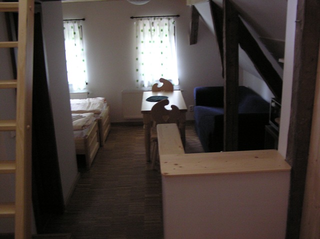 – Znajduje się w 1.NP. Łazienka z WC, kuchnia z lodówką i zamrażarką, mikrofalówka, piekarnik, czajnik. Drewniane schody i pokój na poddaszu