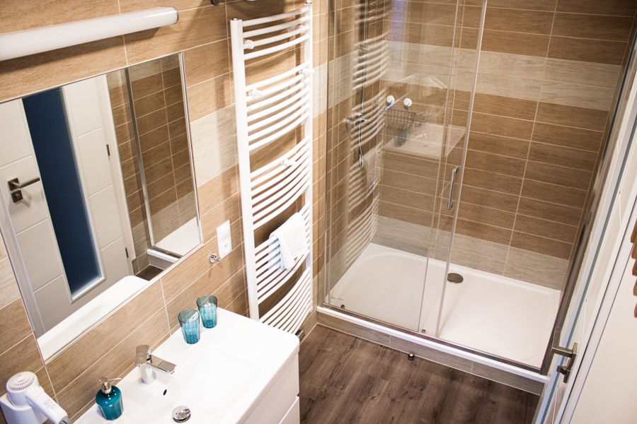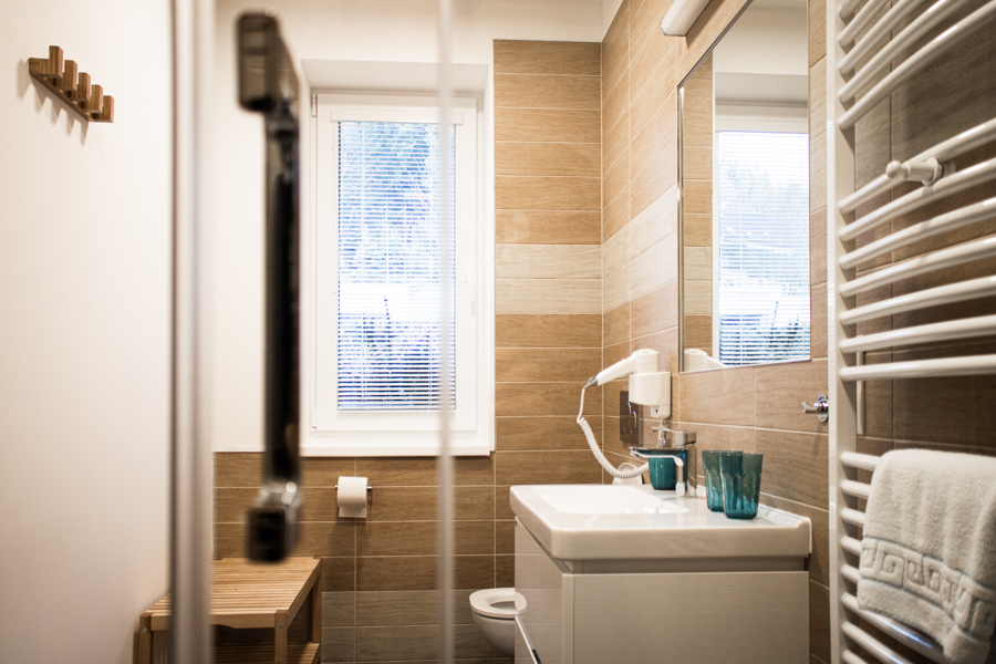 Pokoje są wyposażone w nowoczesne podwójne łóżka ze stolikami nocnymi, lampę i radio, szafę na ubrania, TV + SAT. Każdy pokój ma niezależną łazienkę z prysznicem i WC.