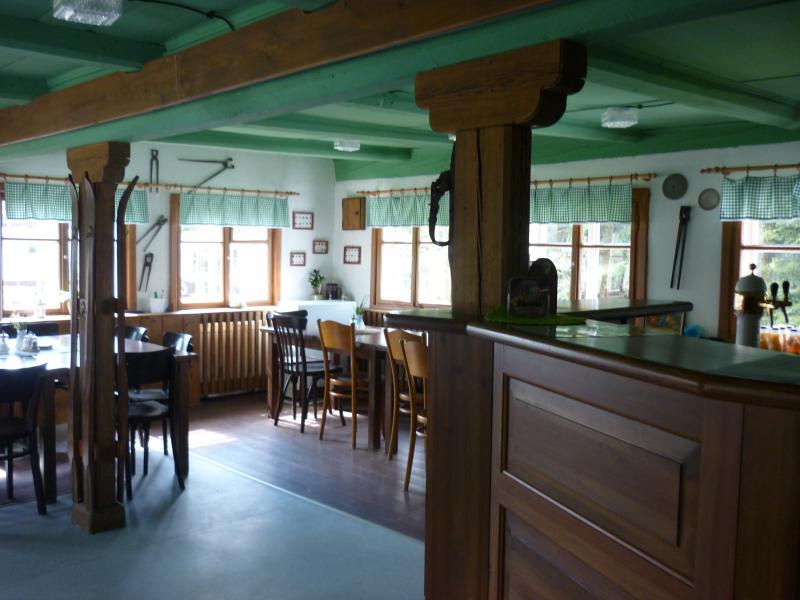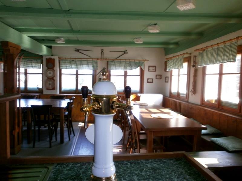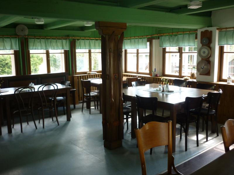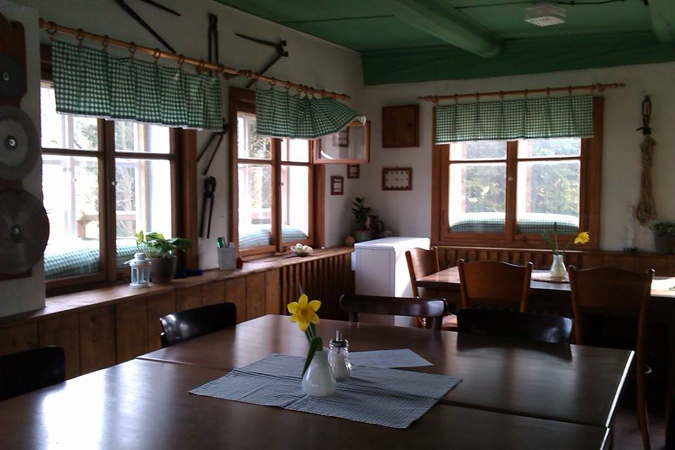 V přízemí chaty se nachází společenská místnost s TV sloužící jako občasná hospůdka pro společenské akce.