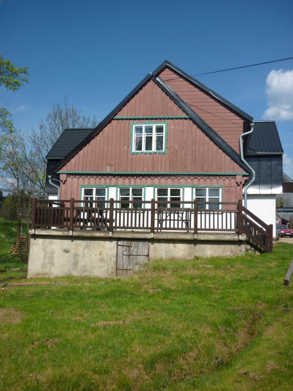 Kolem chaty je k dispozici rozsáhlý, travnatý pozemek navazující na dětské hřiště. Dále pak venkovní terasa s posezením, ohniště a gril.