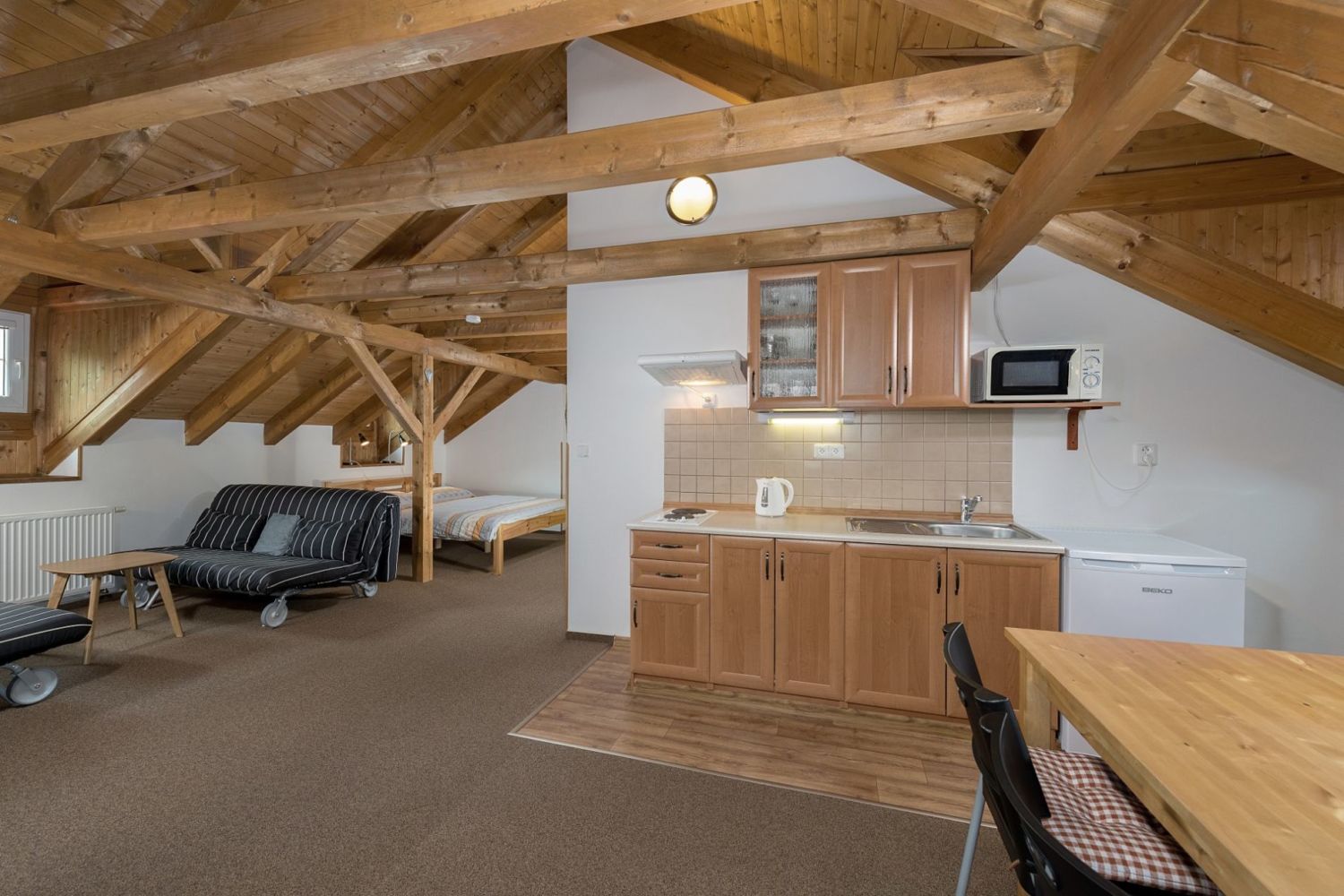 Apartmány mají dispozici 2+kk nebo 2+1, ubytuje se v nich 2–5 osob, v Baráčku 6 osob ve 2 ložnicích, v Chaloupce ve 3 ložnicích 8 osob + dítě na menší posteli. Apartmány i chalupy jsou plně zařízené, nechybí vybavení pro děti – postýlky, jídelní židličky, nočníky. Ve společenské místnosti čeká dětský koutek, na zahradě u penzionu malé dětské hřiště.